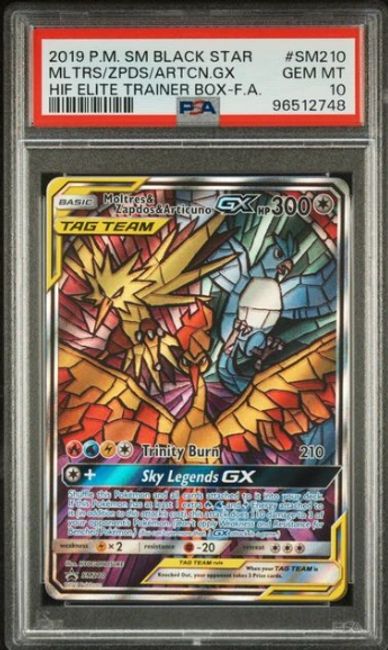 A legendary trio united in one stunning Tag Team card. Graded PSA 10 GEM MINT, this full-art promo from the Hidden Fates Elite Trainer Box captures the brilliance and power of three of Kanto’s most iconic birds in perfect harmony.