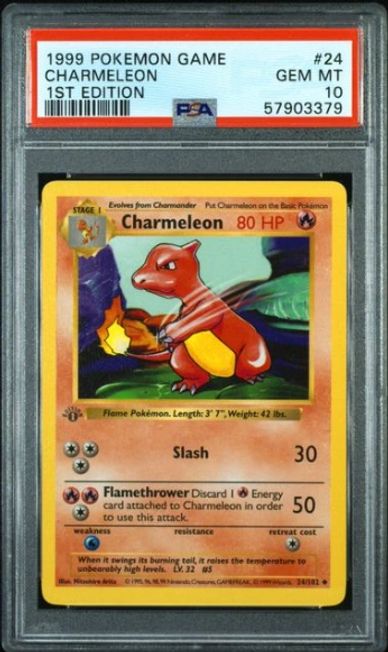 A pristine, first-edition Charmeleon from the original 1999 Pokémon set. Graded PSA 10 GEM MINT, this card represents both rarity and top-tier condition.