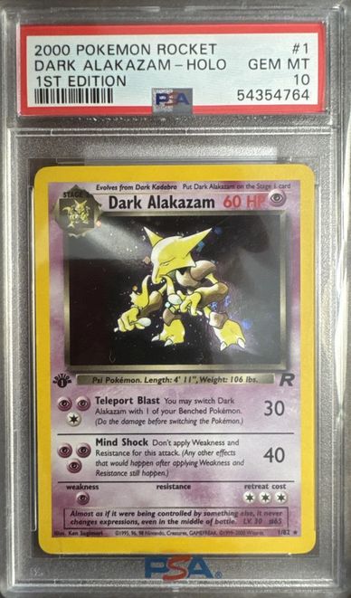 Dark Alakazam stands as a defining symbol of the original Team Rocket storyline, where Pokémon first appeared under the control of villainous forces. This PSA 10 GEM MINT 1st Edition holo preserves an important moment in TCG history, introducing “Dark” Pokémon to the world. Its artwork and pristine presentation make it a standout artifact from the earliest era of collecting.