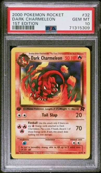 A stunning 1st Edition evolution from the Team Rocket set. Graded PSA 10 GEM MINT, this Dark Charmeleon showcases classic artwork and pristine preservation. A powerful link between base Charmeleon and Dark Charizard.