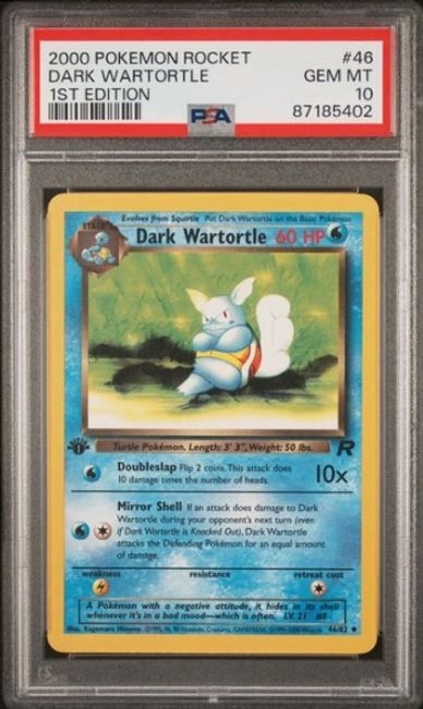 A 1st Edition Dark Wartortle from the Team Rocket set, graded PSA 10 GEM MINT. This rare card showcases the darker twist on a fan-favorite evolution, perfectly preserved as part of the vintage Rocket lineup.